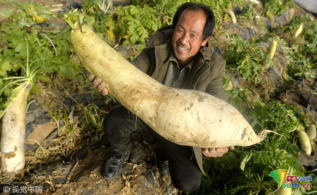 2018年11月10日,辽宁阜新农民李检在采收萝卜时确实下了不少力气,要想拔出他家的萝卜需要两个壮汉合力才行。