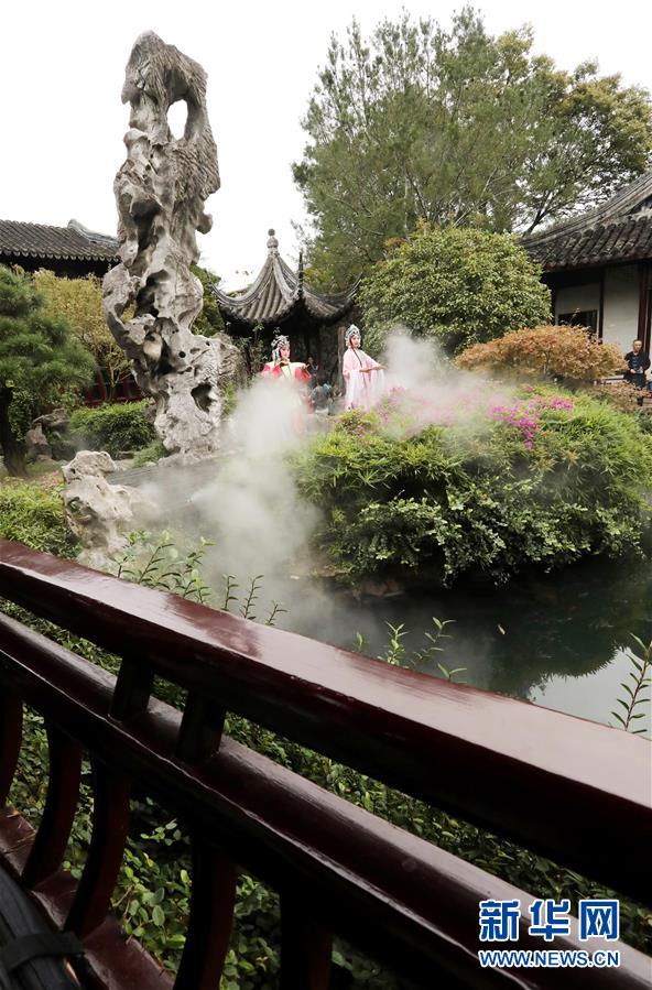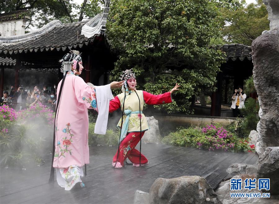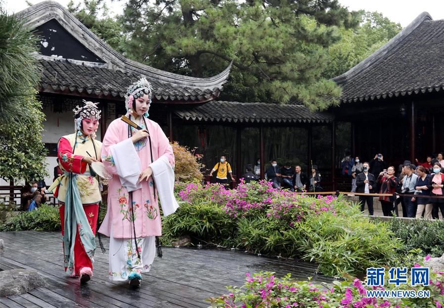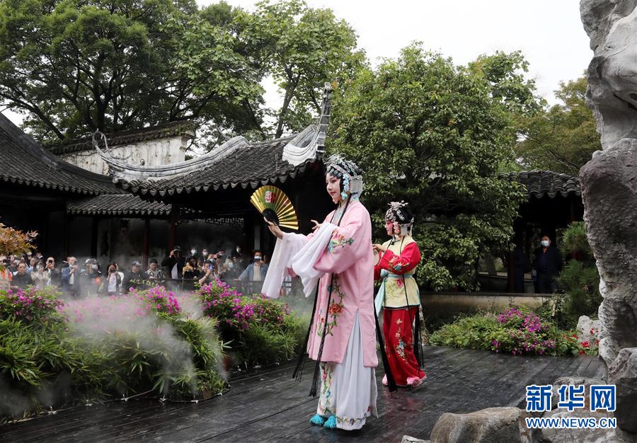 10月7日,演员在苏州留园为游客表演实景版昆曲《牡丹亭》。 国庆中秋长假期间,江苏苏州古典园林留园推出实景版昆曲《牡丹亭》,吸引游客驻足观看。 新华社发(杭兴微 摄)