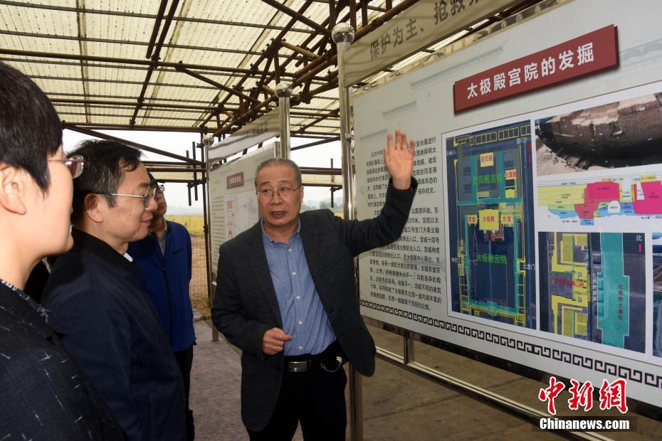 10月10日,河南洛阳,中国历史研究院考古研究所洛阳工作站站长钱国祥研究员(右一)在汉魏洛阳故城太极殿宫院遗址现场,介绍相关考古发掘研究进展等情况。中新社记者 孙自法 摄