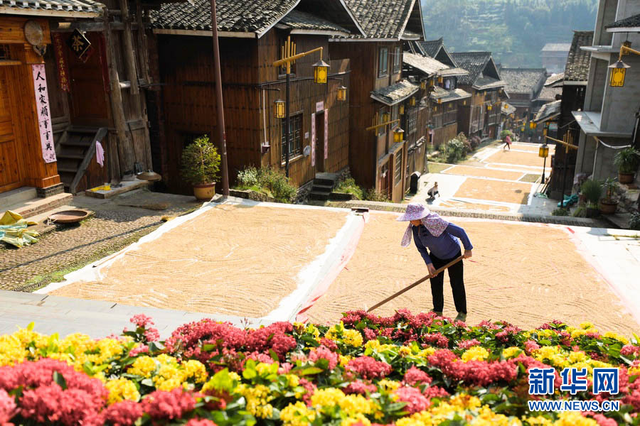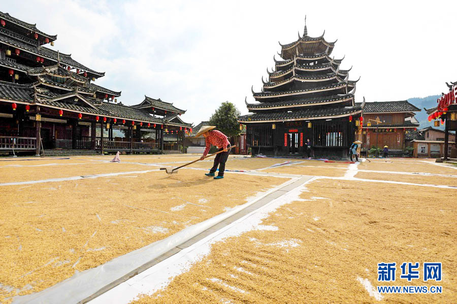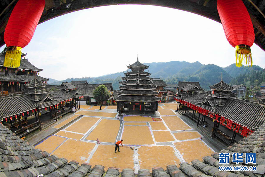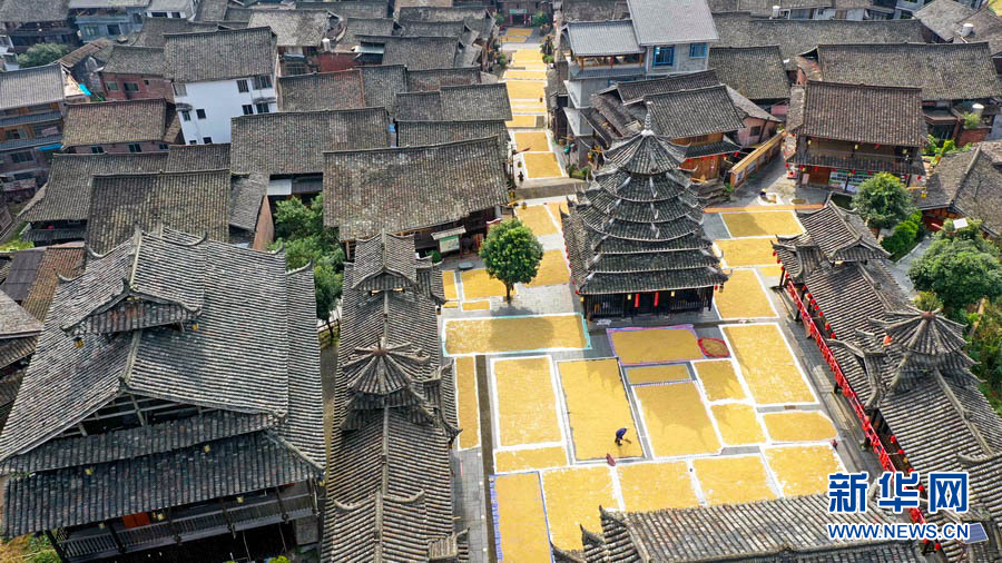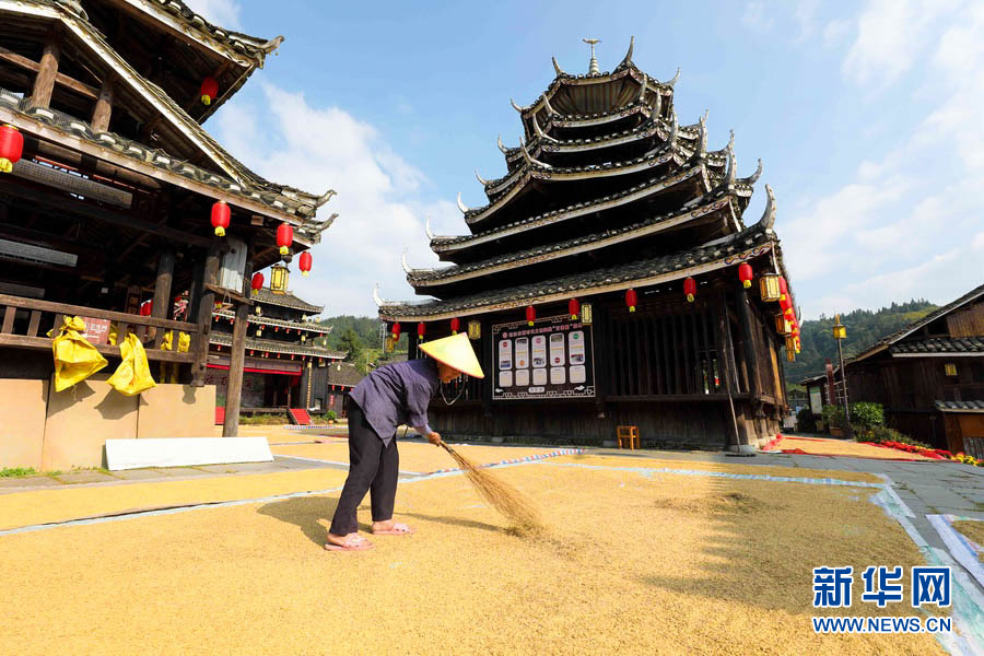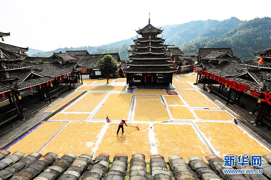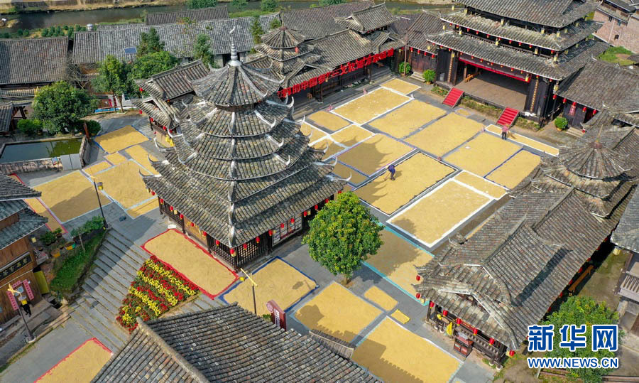 金秋十月,秋高气爽,正是农家晒秋的好时节。在广西柳州市三江侗族自治县,当地村民抢抓晴好天气,利用村寨鼓楼坪、巷道、房顶等场地晾晒稻谷,侗族村寨与金色稻谷相互映衬,构成一幅幅亮丽的丰收画面。(龚普康)