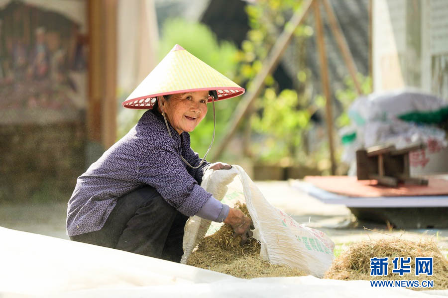 三江林溪镇冠洞村冠小屯村民在晾晒稻谷。