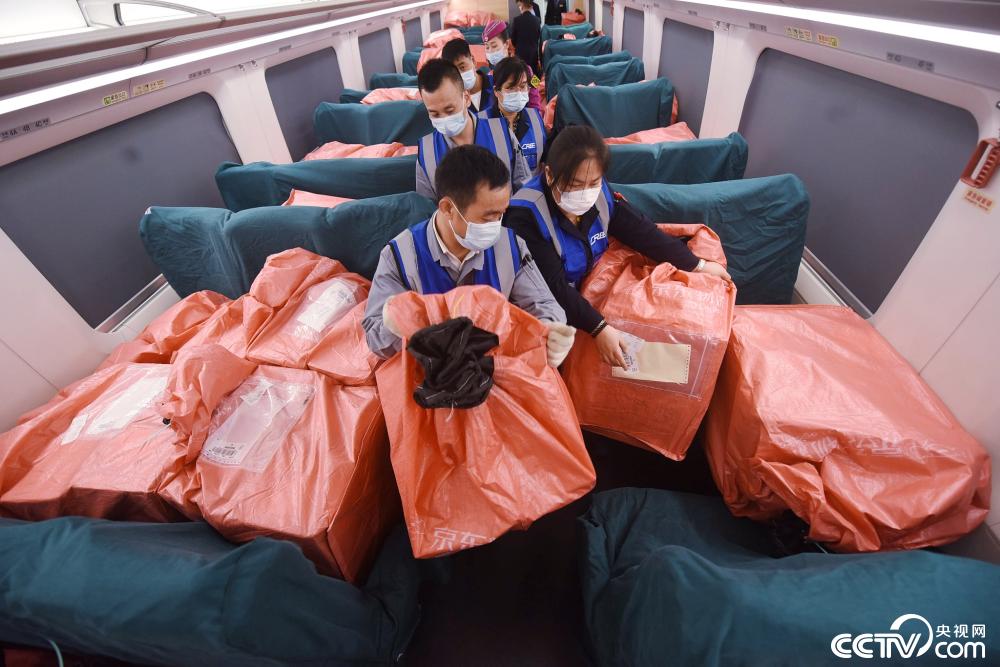 2020年11月11日,铁路工作人员在杭州火车东站将“双十一”的快递包裹运送上杭州-贵阳的G1331次“复兴号”高铁列车。当日,“双十一”快递包裹通过“复兴号”高铁列车G1331次从杭州火车东站出发前往贵阳,这也意味着顾客在“双十一”期间通过高铁快运就可以在享受当日送达(即送)服务。 视觉中国