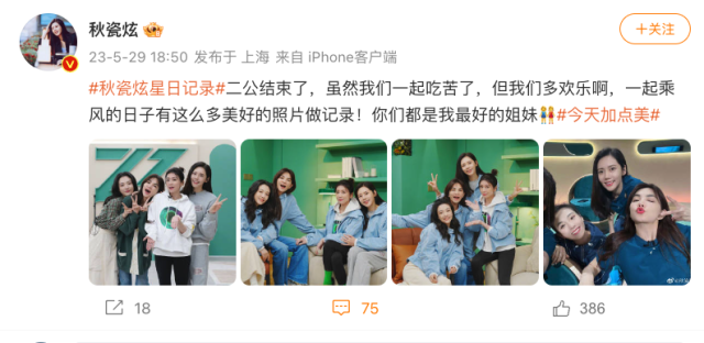 新浪娱乐讯 29日,秋瓷炫晒二公结束与同组组员合照,“二公结束了,虽然我们一起吃苦了,但我们多欢乐啊,一起乘风的日子有这么多美好的照片做记录!你们都是我最好的姐妹”。《乘风2023》二公竞演,Ella组三位姐姐贾静雯、吴倩、秋瓷炫演唱《一起吃苦的幸福》。