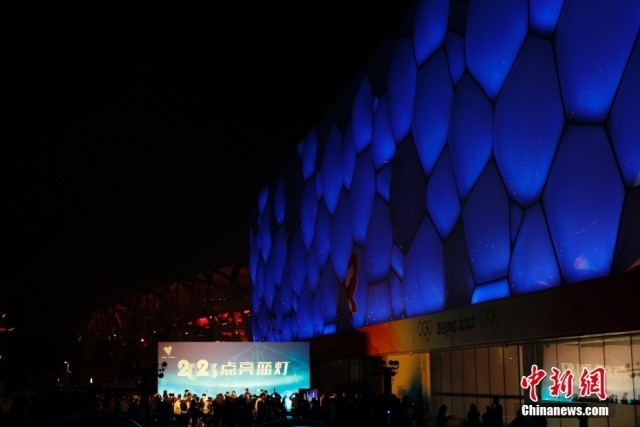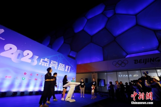 4月2日,是第16个世界孤独症日。国家游泳中心(水立方/冰立方)第十三次为“星星的孩子”点亮蓝灯。图为点灯仪式。