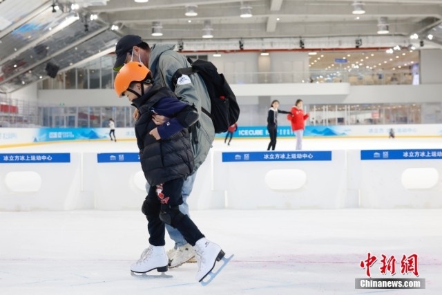 4月2日,是第16个世界孤独症日。国家游泳中心(水立方/冰立方)第十三次为“星星的孩子”点亮蓝灯。图为“星星的孩子”在家人的陪伴下进行冰上亲子体验。