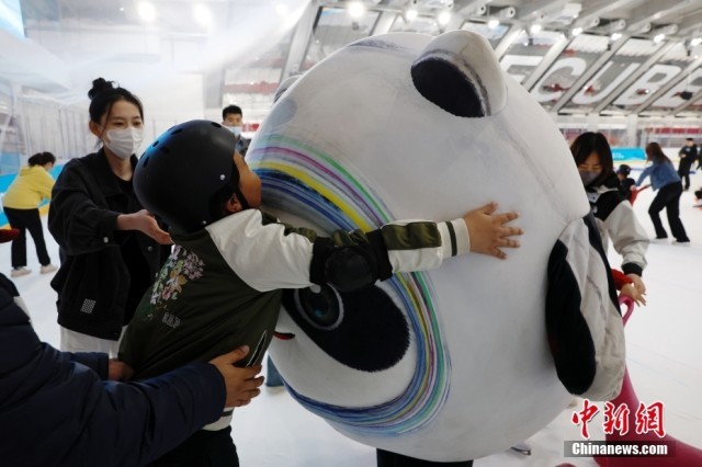 4月2日,是第16个世界孤独症日。国家游泳中心(水立方/冰立方)第十三次为“星星的孩子”点亮蓝灯。图为“星星的孩子”与冰墩墩人偶互动。