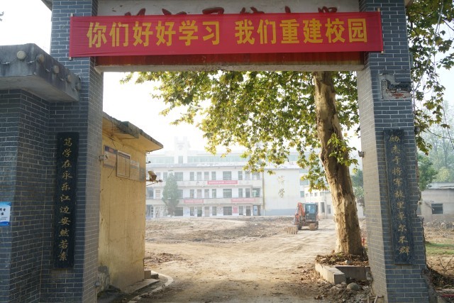 8月31日,湖南资兴,开学日,州门司镇中学校门上挂着横幅:“你们好好学习,我们重建校园”。如今,洪灾已过去一个多月,校园内仍遍布泥土。中青报·中青网从州门司镇中学了解到,因受到台风“格美”带来的强降雨影响,该中学受到洪水冲击,校内教学楼、宿舍楼、食堂等受灾严重,是这场洪灾中受灾最严重的学校之一。中青报·中青网记者 李强/摄