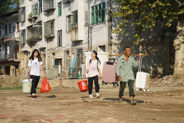 8月31日,湖南资兴,州门司镇中学的教职工把课桌搬到操场上,擦拭掉灰尘,等待前来集合的学生,随后他们会乘车前往8公里外的资兴市二中入学。受灾后,州门司镇中学的部分教学楼初步鉴定为危房,学校无法在原址开学,所有师生一同转入资兴市二中。中青报·中青网记者 李强/摄
