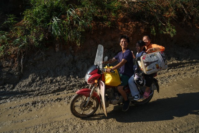 8月31日,湖南资兴,州门司镇燕窝村受灾村民骑着摩托送女儿去上学,沿途部分路段泥泞不堪,尚在抢修,这条路暂时没能恢复到受灾前的样子。中青报·中青网记者 李强/摄