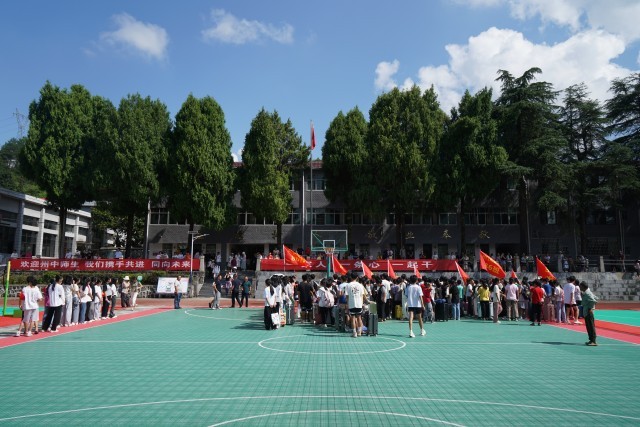 8月31日,湖南资兴,州门司镇中学学生在资兴市二中的校园里,操场边拉着欢迎横幅。资兴市二中校长何杰告诉中青报·中青网记者,为迎接新同学的到来,资兴市二中扩容了教室、宿舍、食堂,未来两所学校将实行统一管理、融合办学。中青报·中青网记者 李强/摄