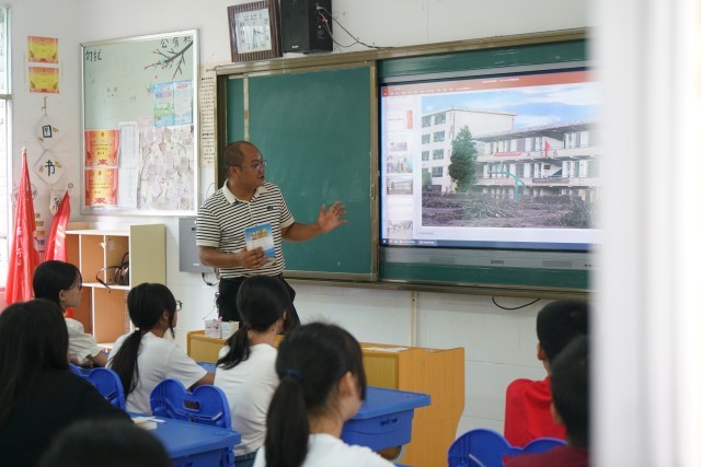 8月31日,湖南资兴,州门司镇中学校长李春江正在给同学们讲述州门司镇中学灾后重建的故事。中青报·中青网记者 李强/摄