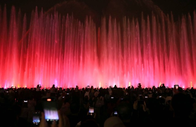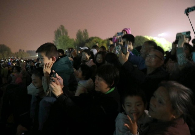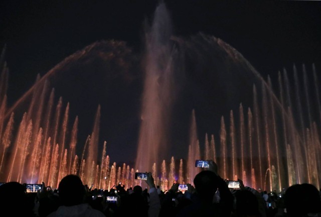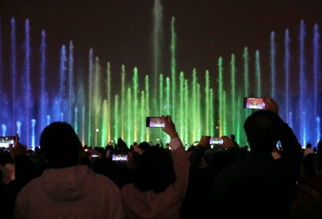 10月5日,北京,奥林匹克森林公园,游人用手机拍摄喷泉灯光秀。中青报·中青网记者 陈剑/摄