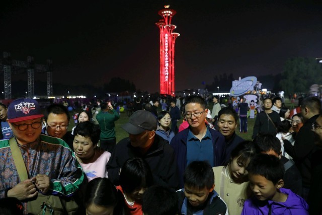 10月5日,北京,奥林匹克森林公园,灯光秀结束后,游人准备离开。中青报·中青网记者 陈剑/摄