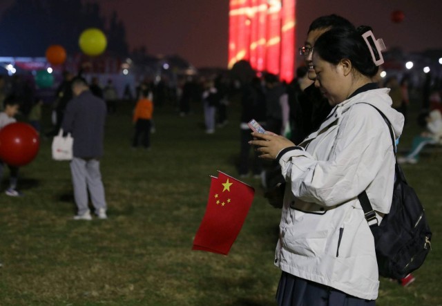 10月5日,北京,奥林匹克森林公园,拿着国旗的游人,等待灯光秀的开始。中青报·中青网记者 陈剑/摄