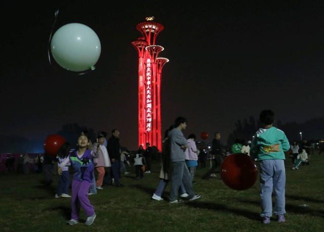 10月5日,北京,奥林匹克森林公园,小朋友在奥林匹克塔下快乐地玩着气球。中青报·中青网记者 陈剑/摄