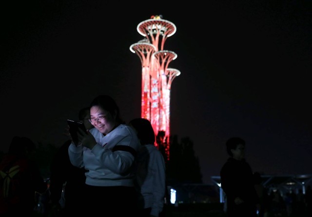 10月5日,北京,奥林匹克森林公园,奥林匹克塔下游人如织。据介绍,国庆节长假期间的夜晚,奥林匹克塔上演以“花团锦簇喜迎国庆”为主题的灯光秀。中青报·中青网记者 陈剑/摄
