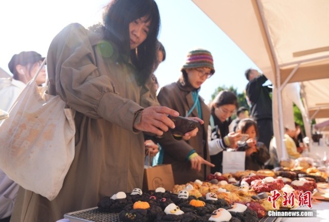 10月19日,北京市,民众在朝阳公园的北京面包节上边逛边吃,休闲度周末。图为各式造型的面包吸引市民。
