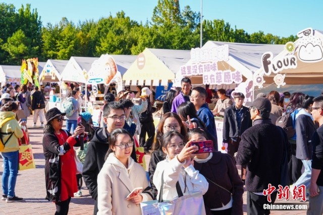 10月19日,北京市,民众在朝阳公园的北京面包节上边逛边吃,休闲度周末。图为市民在北京面包节现场合影留念。