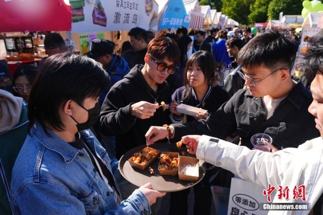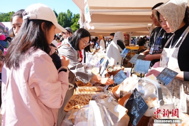 10月19日,北京市,民众在朝阳公园的北京面包节上边逛边吃,休闲度周末。图为商家为参观的市民提供试吃产品。