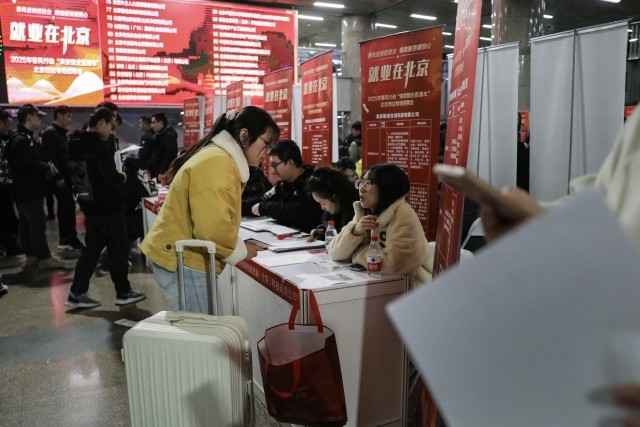 2月28日,北京西站,2025年春风行动“来京就业直通车”专场招聘会上,来自河北邯郸的小胡与一家科技公司的招聘人员沟通。小胡是新闻专业的应届毕业生,由于考研成绩不理想,她决定先找工作试试,此次来北京就是为了参加几家公司的面试。她在出站途中遇上火车站里的招聘会,便推着行李箱边走边看,这家科技公司正在招聘新媒体运营的岗位引起了她的兴趣,双方互留了联系方式。