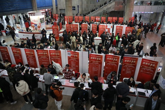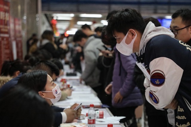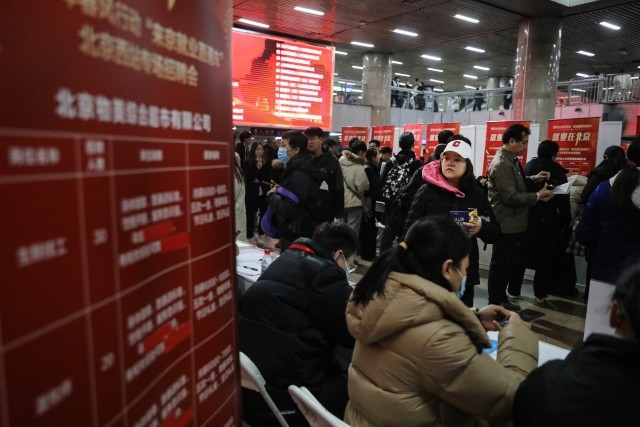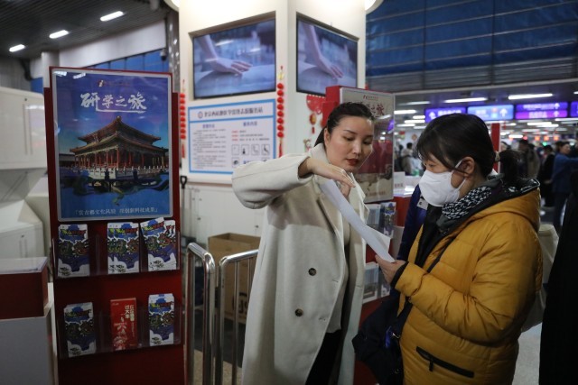 2月28日,北京西站,北京市内的求职者和刚下火车的旅客在招聘会现场与用人单位面对面交流。中青报·中青网记者 孔斯琪/摄