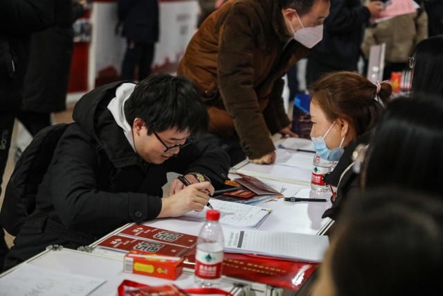 2月28日,北京西站,2025年春风行动“来京就业直通车”专场招聘会,26岁的北京人王晨正在一家企业的摊位前填写求职登记表。从北京信息科技大学电气工程专业本科毕业后,他有过两年工作经验,做过销售,也试过考研、考公,成绩都不理想,“竞争压力太大了”。去年考完研后他就开始海投简历,线下招聘会也去了不少,渴望找到一份稳定的国企工作。目前,他仍在继续读书深造和就业之间摇摆不定,他坦言,曾经校招时自己看不上的国企如今一岗难求,担心读完研究生后年龄大了找工作更难。中青报·中青网记者 孔斯琪/摄
