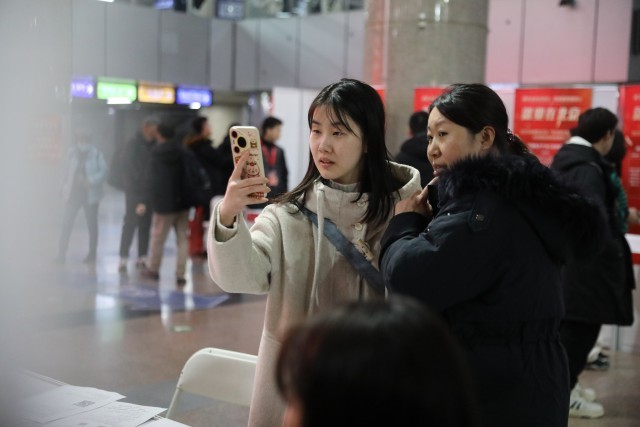 2月28日,北京西站,2025年春风行动“来京就业直通车”专场招聘会上,求职者拍照记录感兴趣的岗位信息。中青报·中青网记者 孔斯琪/摄