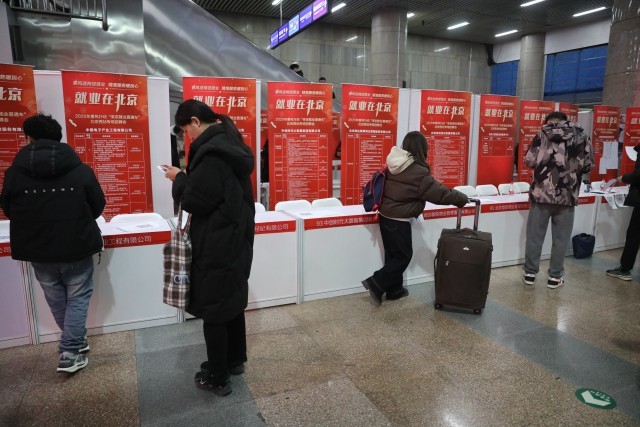 2月28日,北京西站,2025年春风行动“来京就业直通车”专场招聘会上,一名求职者仔细阅读用人单位的信息。中青报·中青网记者 孔斯琪/摄