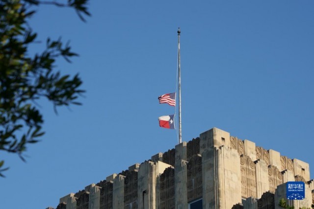 5月24日,位于美国得克萨斯州首府奥斯汀的一栋政府大楼降半旗,向枪击事件受害者致哀。当天,得克萨斯州南部尤瓦尔迪市一所小学发生枪击事件,造成至少19名儿童和2名教师死亡。