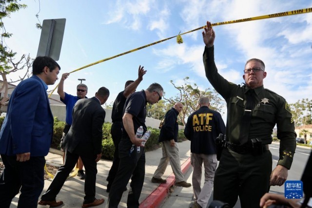 5月15日,在美国加利福尼亚州奥兰治县,执法人员在案发现场工作。当天,加利福尼亚州奥兰治县一个教堂发生枪击事件,造成1人死亡、5人受伤。