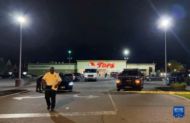 5月14日,警察在美国纽约州布法罗市的枪击案现场工作(手机拍摄)。当天,纽约州布法罗市一家超市发生枪击事件,造成至少10人死亡、3人受伤。枪手为18岁男性,身穿战术装备并戴头盔,还通过摄像头在线直播枪击过程。发生枪击的超市所在社区以非洲裔居民为主。