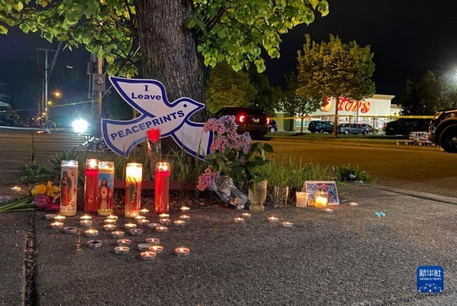 5月15日凌晨,人们在美国纽约州布法罗市的枪击案现场附近摆放蜡烛纪念遇难者(手机拍摄)。5月14日,纽约州布法罗市一家超市发生枪击事件,造成至少10人死亡、3人受伤。枪手为18岁男性,身穿战术装备并戴头盔,还通过摄像头在线直播枪击过程。发生枪击的超市所在社区以非洲裔居民为主。