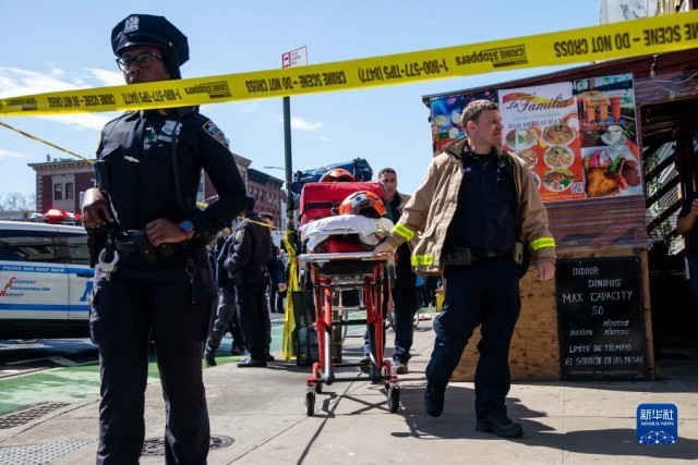 4月12日,警察和救护人员在美国纽约发生枪击的地铁站附近工作。当天,纽约市布鲁克林区一地铁站发生枪击事件,造成20多人受伤。警方说,嫌疑人先扔出两枚烟幕弹,然后用手枪对地铁乘客射击,打伤10人。另有十余人因吸入烟雾、跌倒等原因受伤。