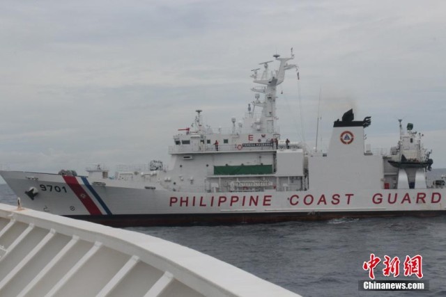 8月31日12时许,非法滞留中国仙宾礁的菲律宾9701号船寻衅肇事,位中国海警5205舰左舷,故意冲撞5205舰,并发生碰撞。中国海警依法依规对其采取管控措施。图为现场整体态势。