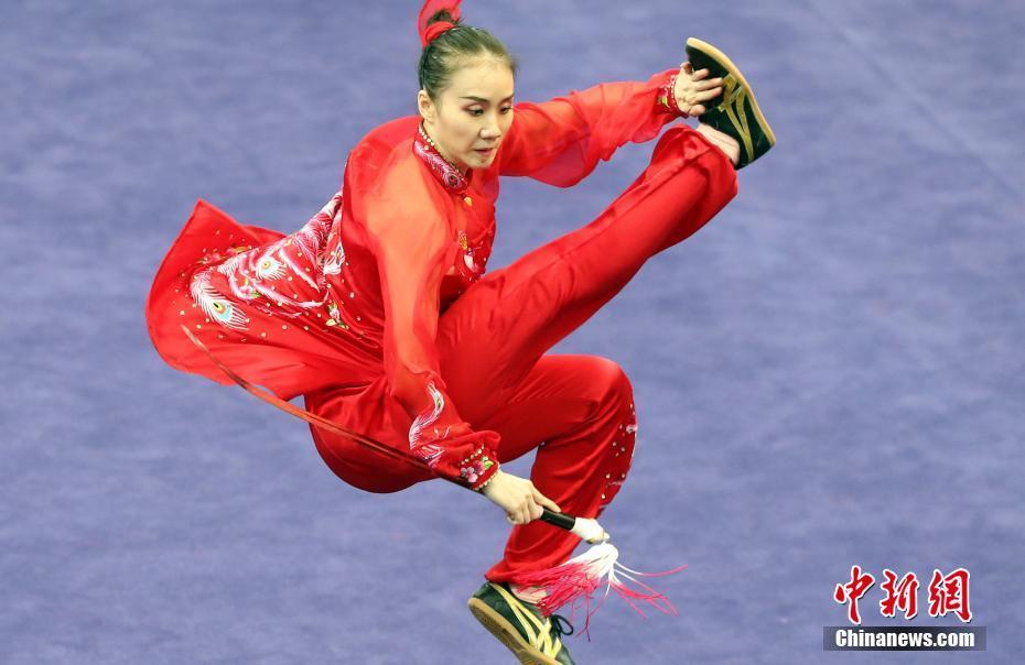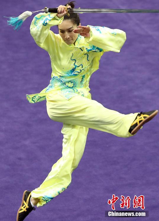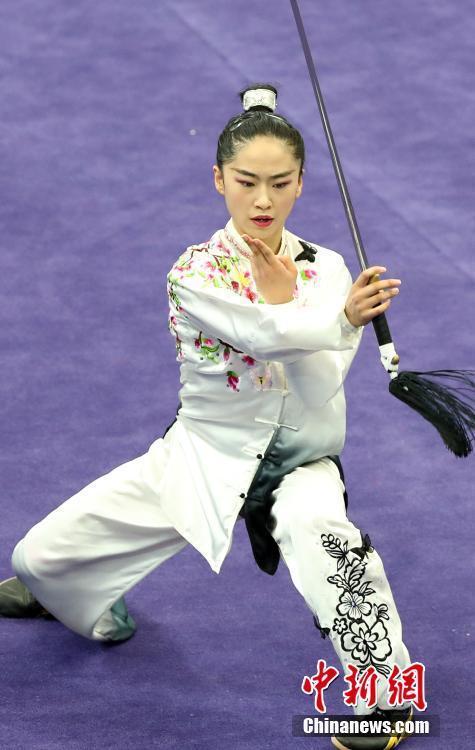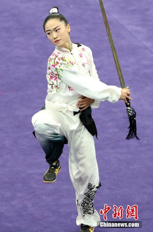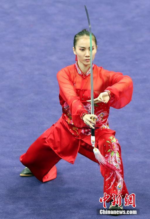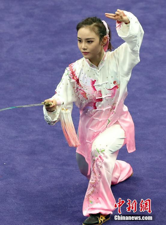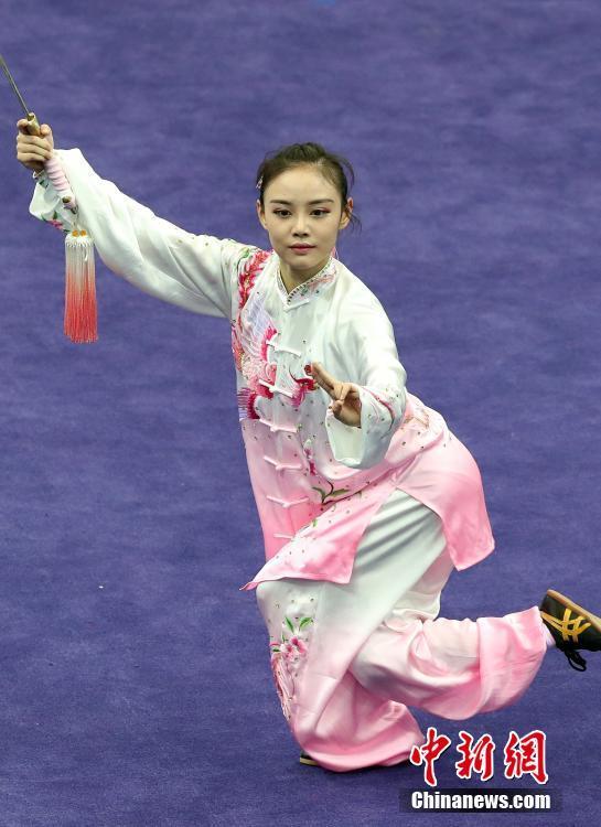 8月28日,天津全运会武术套路比赛在天津理工大学体育馆举行,图为福建选手庄莹莹在女子太极剑比赛中。中新社记者 张宇 摄