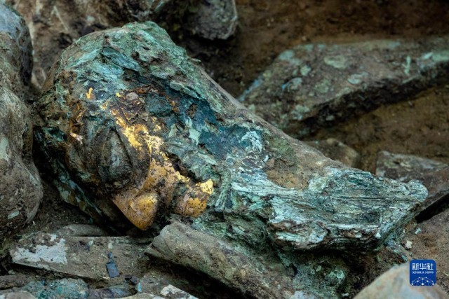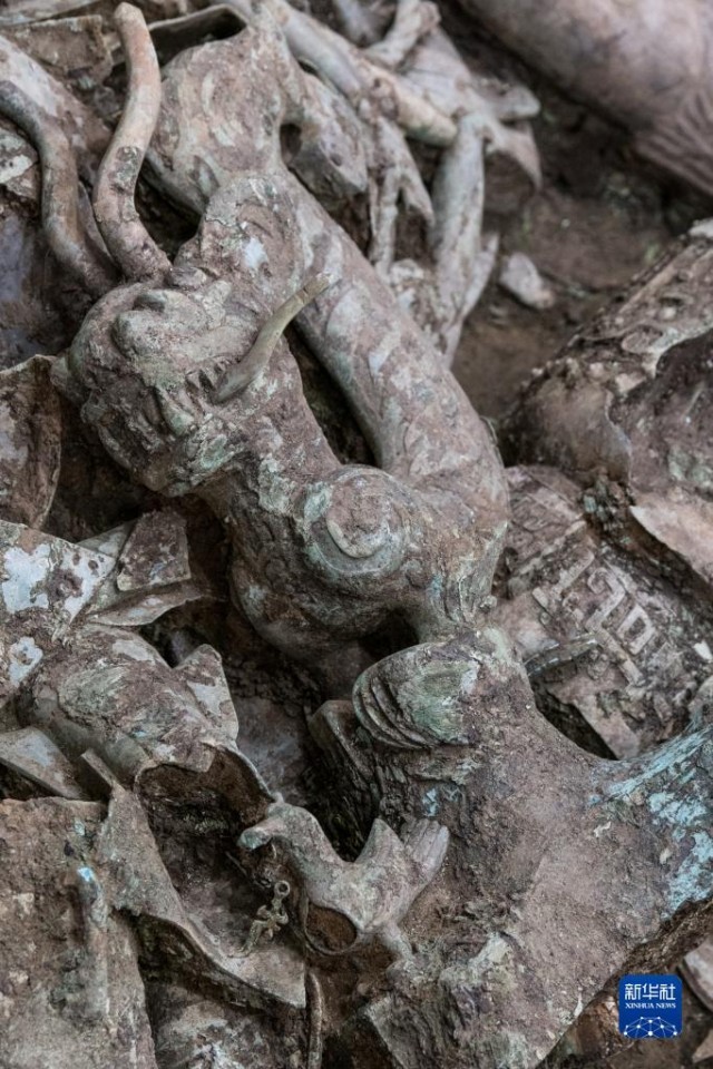 这是在三星堆遗址8号“祭祀坑”拍摄的铜龙(5月31日摄)。