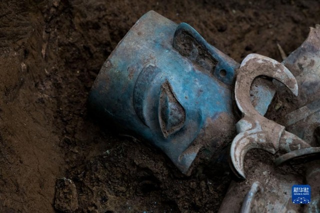 这是在三星堆遗址8号“祭祀坑”拍摄的铜面具(6月1日摄)。