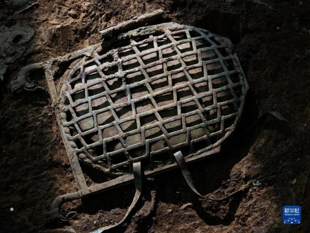 这是在三星堆遗址7号“祭祀坑”拍摄的龟背形网格状器(6月1日摄)。