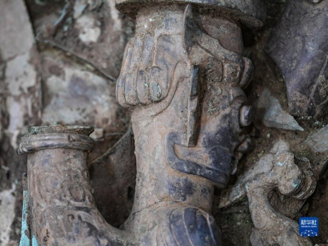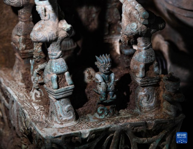 这是在三星堆遗址8号“祭祀坑”拍摄的铜神坛局部(6月1日摄)。