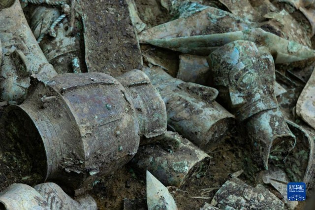 这是在三星堆遗址拍摄的8号“祭祀坑”中的器物(6月1日摄)。