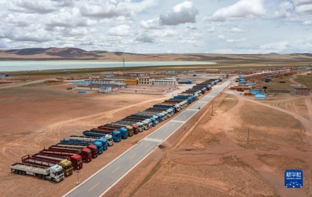 运输家具的货车在双湖县多玛乡果根擦曲村集合(7月12日摄,无人机照片)。