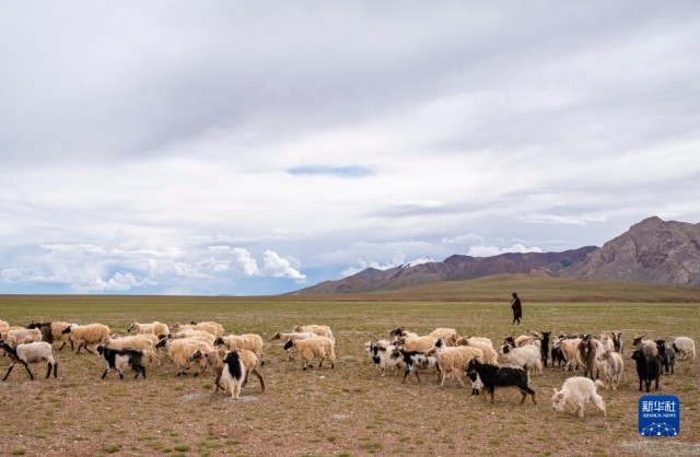 双湖县多玛乡仲鲁玛村牧民在放牧(7月13日摄)。