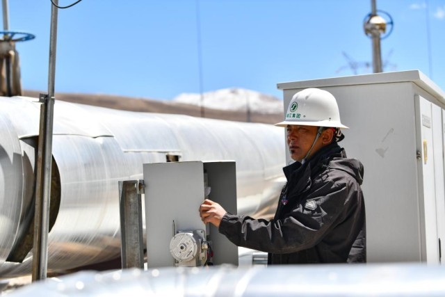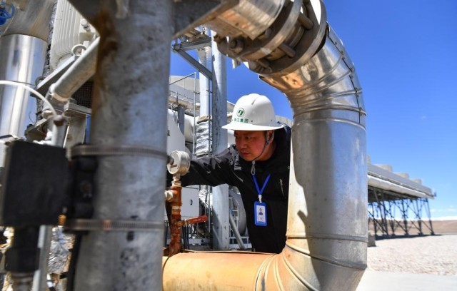 羊易地热电站工作人员在检查设备状况(4月6日摄)。
