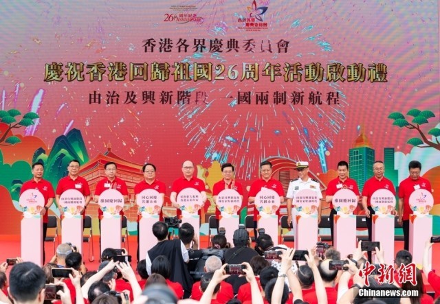 6月30日,香港各界庆典委员会“庆祝香港回归祖国26周年”系列活动启动典礼在维多利亚公园举行,香港特区行政长官李家超、香港中联办主任郑雁雄、外交部驻港特派员公署副特派员潘云东、中央政府驻港国安公署副署长李江舟、解放军驻港部队政委赖如鑫等出席典礼启动仪式。