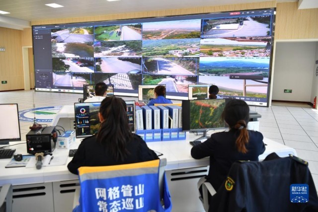 西安市鄠邑区秦岭保护总站的工作人员在信息化大厅内工作(2022年5月6日摄)。