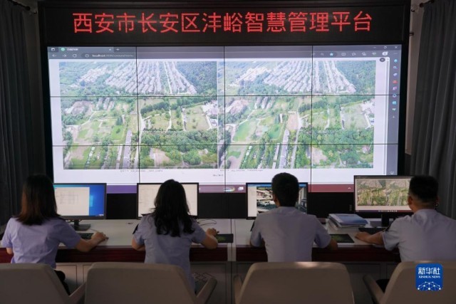 8月29日,西安市长安区沣峪国有生态林场的工作人员通过智慧管理平台查看同一地块不同时期的画面,防治“乱搭乱建”等现象。