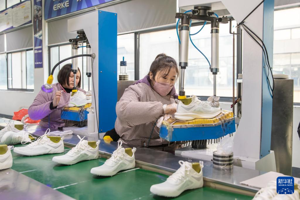 1月24日,在河南省商丘市睢县一家体育用品企业,制鞋女工在车间内作业。