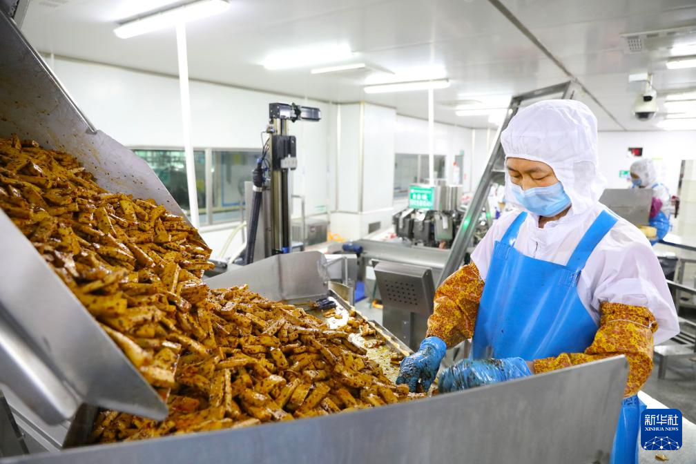 1月24日,在重庆市梁平区一家豆制品企业,工人在豆干生产线上忙碌。