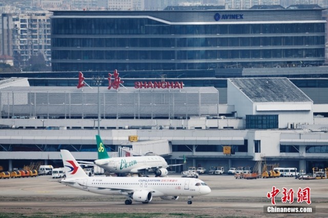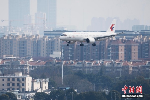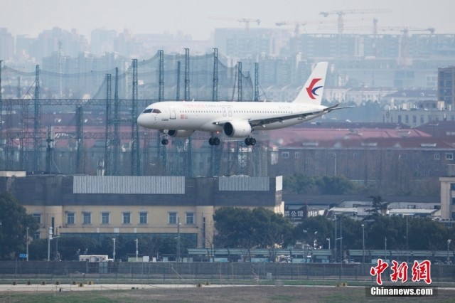 2月26日,在完成新加坡航展的展示后,东航注册号为B-919A的全球首架C919大型客机经过5个小时“一站式”飞行,从新加坡樟宜机场顺利飞抵上海虹桥国际机场。图为东航C919大型客机抵达上海虹桥国际机场。