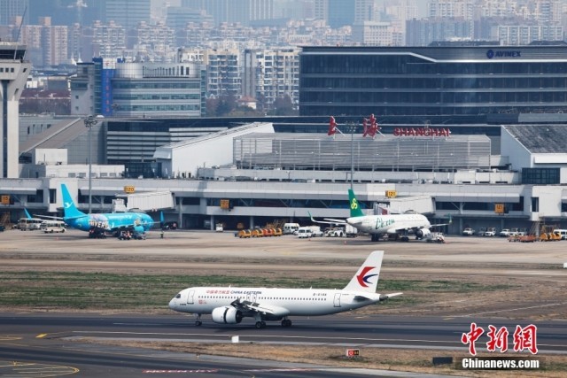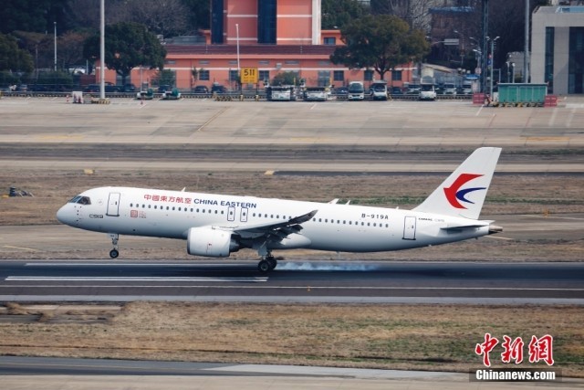 2月26日,在完成新加坡航展的展示后,东航注册号为B-919A的全球首架C919大型客机经过5个小时飞行,从新加坡樟宜机场顺利飞抵上海虹桥国际机场。图为东航C919大型客机抵达上海虹桥国际机场。
